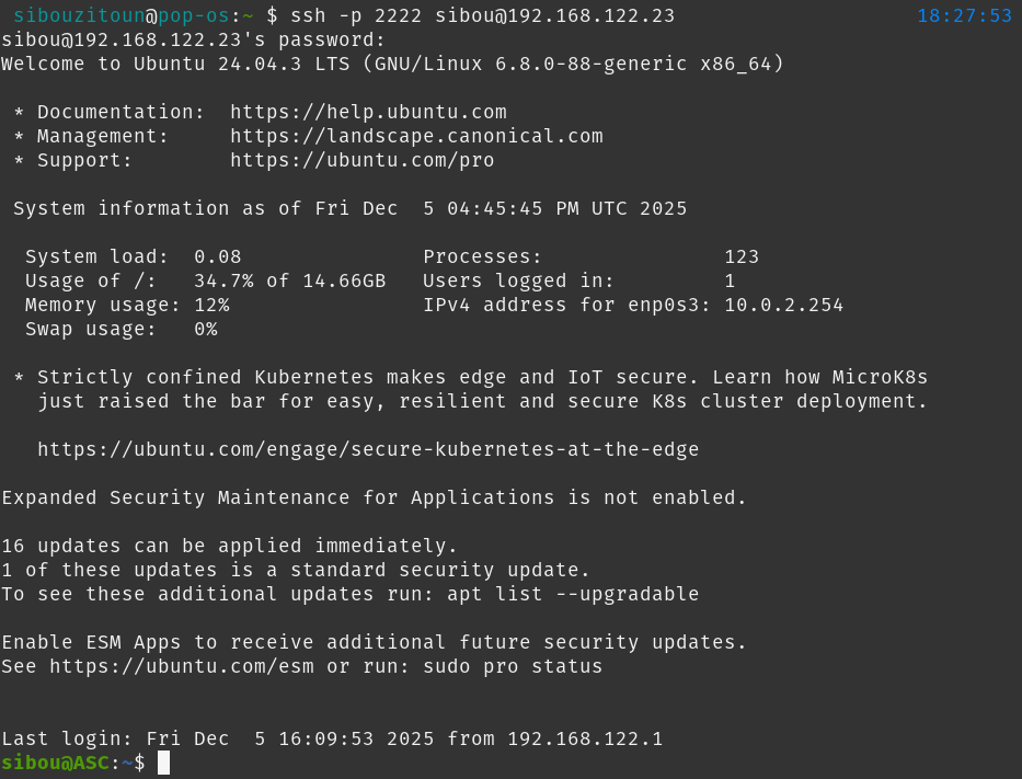 Next, we validated the remote accessibility of the agents via the previously configured Port Forwarding rules. The following capture illustrates a successful SSH connection to the Central Server Agent (ASC) by targeting port 2222 of the router.
