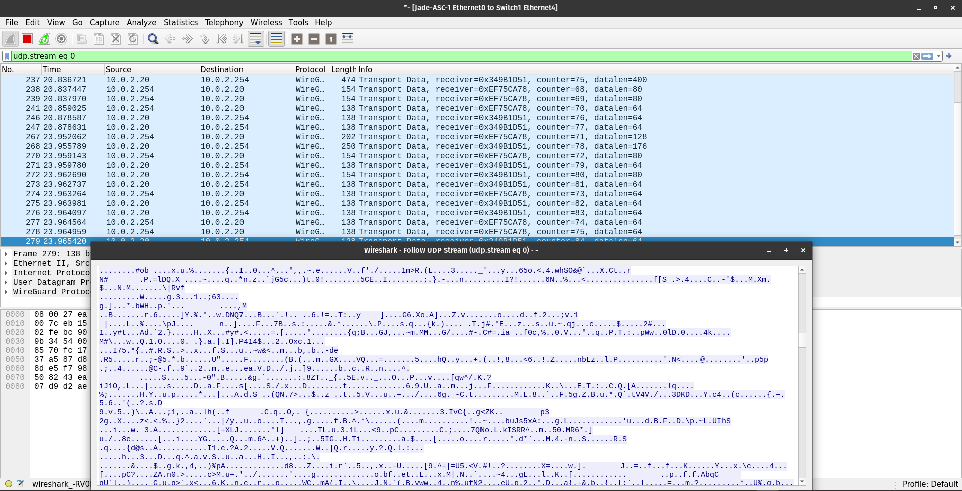 Once the VPN was established and JADE was re-bound to the wg0 interface, we performed a final security audit using Wireshark.