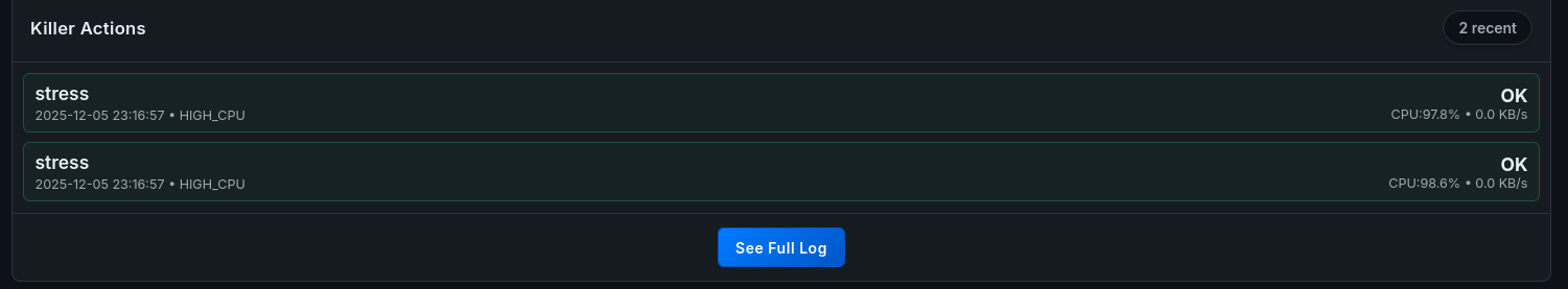 Observation: The Dashboard’s Network graph accurately reflects the throughput spike (100 MB/s). Crucially, because the process causing the traffic was whitelisted (simulating legitimate VoIP), the system did not kill the process but flagged it for review, demonstrating the whitelist logic’s effectiveness.