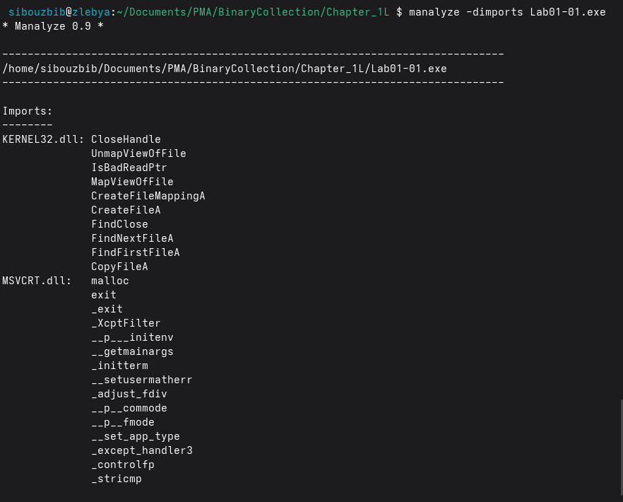 The initial scan output shows no evidence of a packed executable. To confirm this further, we examine the imports table using the -dimports flag.