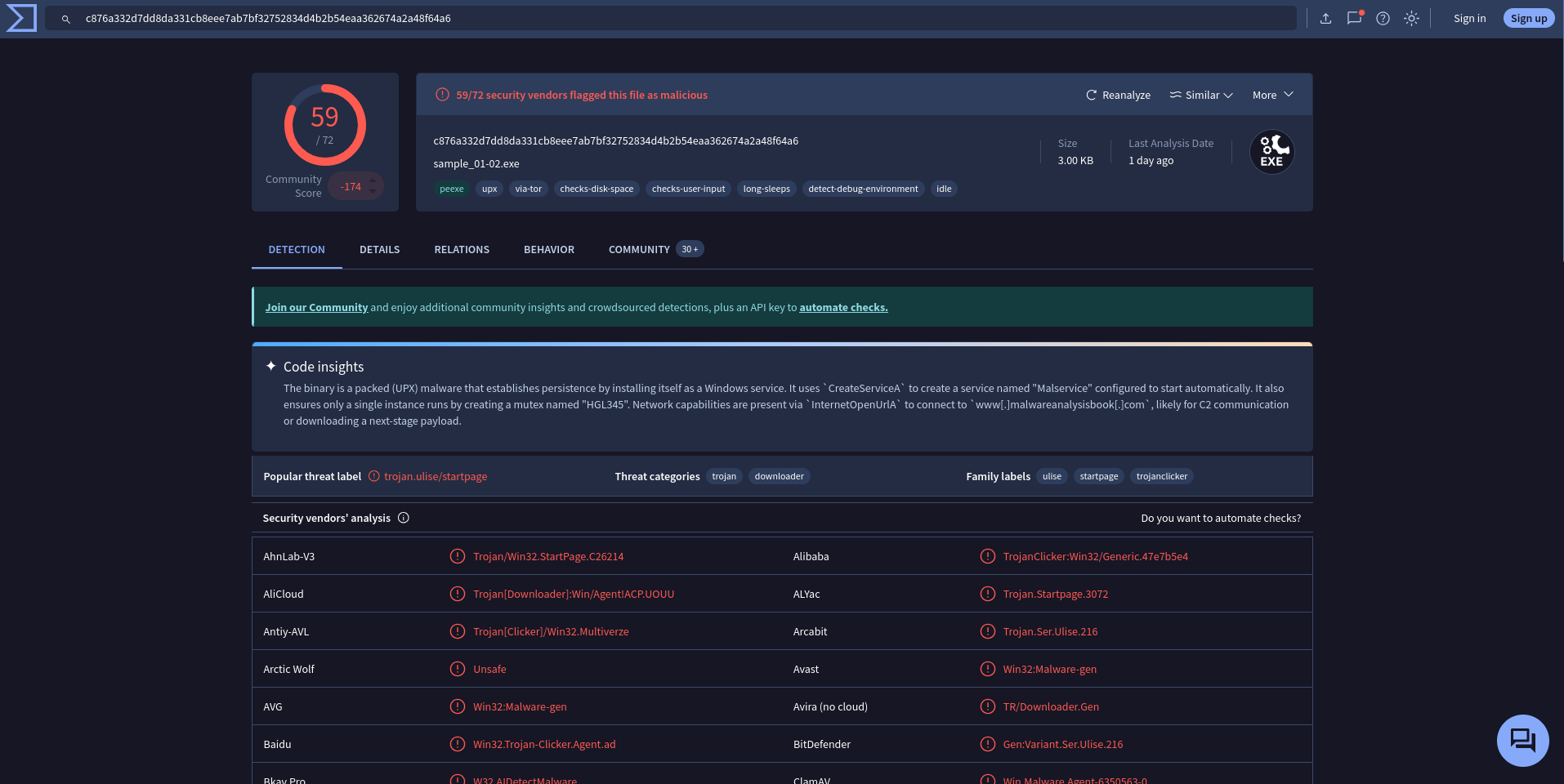 The exe match multiple existing AV definitions and is flagged by 59 out of 72 AVs.
