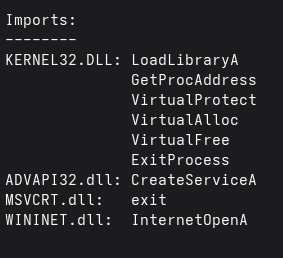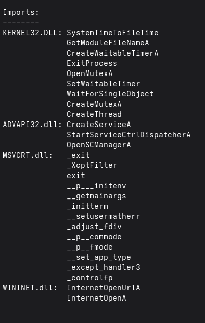 Several of the imported functions give very clear hints about the program’s intended behavior. The most revealing imports come from ADVAPI32.dll: CreateServiceA, OpenSCManagerA, and StartServiceCtrlDispatcherA. These APIs are typically only used by programs designed to install or manage Windows services. Their presence strongly suggests that the program attempts to install itself as a persistent Windows service, likely to ensure it runs automatically at system startup and operates with elevated privileges. This is a common persistence technique employed by malware.