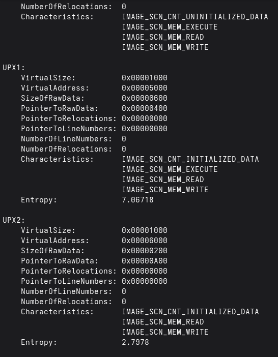 As expected, this binary is packed. The section names are atypical, and the second section shows an entropy of 7.06, indicating high randomness and obfuscation. The packer appears to be UPX, as suggested by the section names.