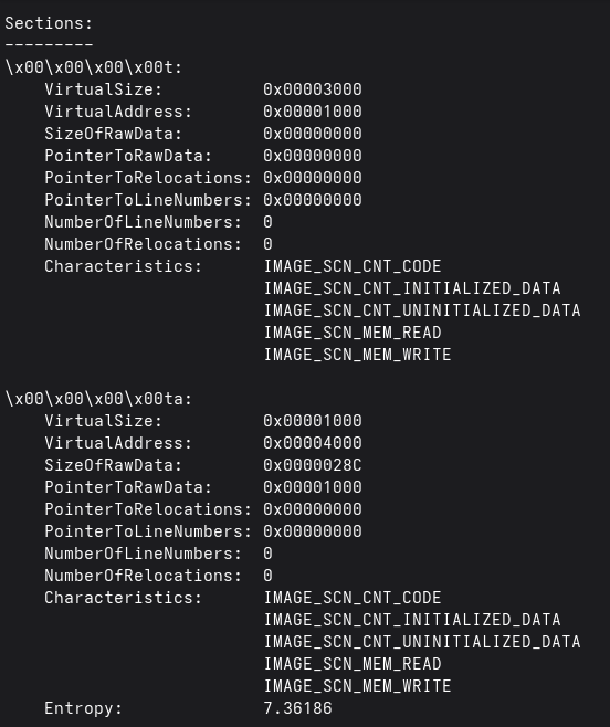 This binary is clearly packed, as indicated by the warning message from Manalyze. The compilation date is also suspicious, corresponding to the epoch (0), which is often a sign of tampering or packing. Attempting to view the import table results in an error, and the section analysis shows that most sections contain meaningless or junk values, further confirming that the file is obfuscated.