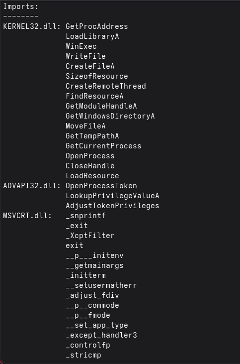 Examining the extracted resource confirms that the executable is acting as a dropper. The embedded PE is a fully functional Windows executable rather than configuration data or benign assets such as icons or dialogs. This indicates that the primary executable’s role is to unpack and deploy a second-stage payload at runtime. The use of Windows API functions such as GetTempPathA, GetWindowsDirectoryA, and WinExec further supports this behavior, as they allow the malware to write the extracted file to disk, likely in a temporary or system directory—and then execute it. This technique is commonly used to evade static detection by separating the loader logic from the main malicious payload.