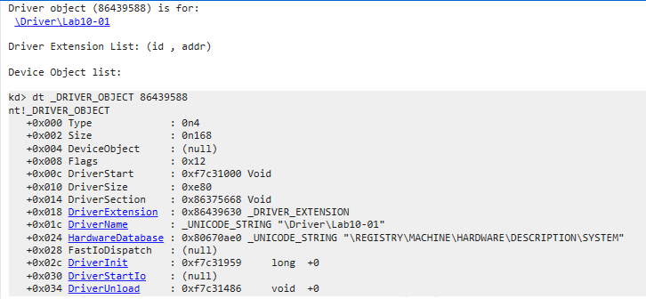 The challenge here is timing. Because the driver unloads immediately after the ControlService call, simply running the program and trying to find the module later with lm m Lab* will fail, the module will already be gone.