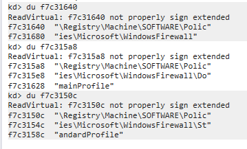 The malware prepares a DWORD value of 0 (seen in the local variable initialization) and writes it to the EnableFirewall value name within both the DomainProfile and StandardProfile keys.