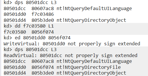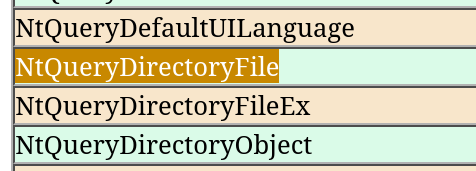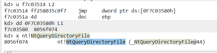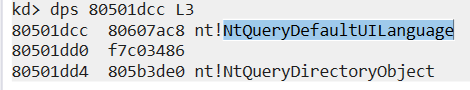 A quick way to check what function got “hooked”, is checking whats its index in the SSDT, and instead of making a full calculation, I chose a lazier approach. Since SSDT entries are fixed, I checked what entry was before and after the hooked entry using dps 80501dcc L3, and it was sandwiched between NtSystemDebugControl and NtQueryDefaultUILanguage. Using an online reference (like “https://j00ru.vexillium.org/syscalls/nt/32/”), we find out the entry replaced was NtQueryDirectoryFile which makes total sense.