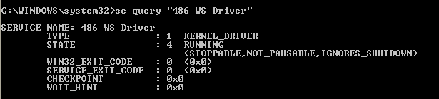The lm command fails to show Mlwx486.sys, even though we know the service “486 WS Driver” is running.