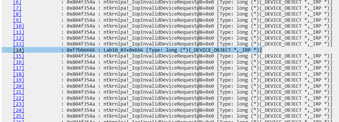 We are specifically interested in the MajorFunction table. Checking the offsets, we see that the driver only supports IRP_MJ_CREATE (Index 0), IRP_MJ_CLOSE (Index 1), and IRP_MJ_DEVICE_CONTROL (Index 14). All other indexes point to _IopInvalidDeviceRequest