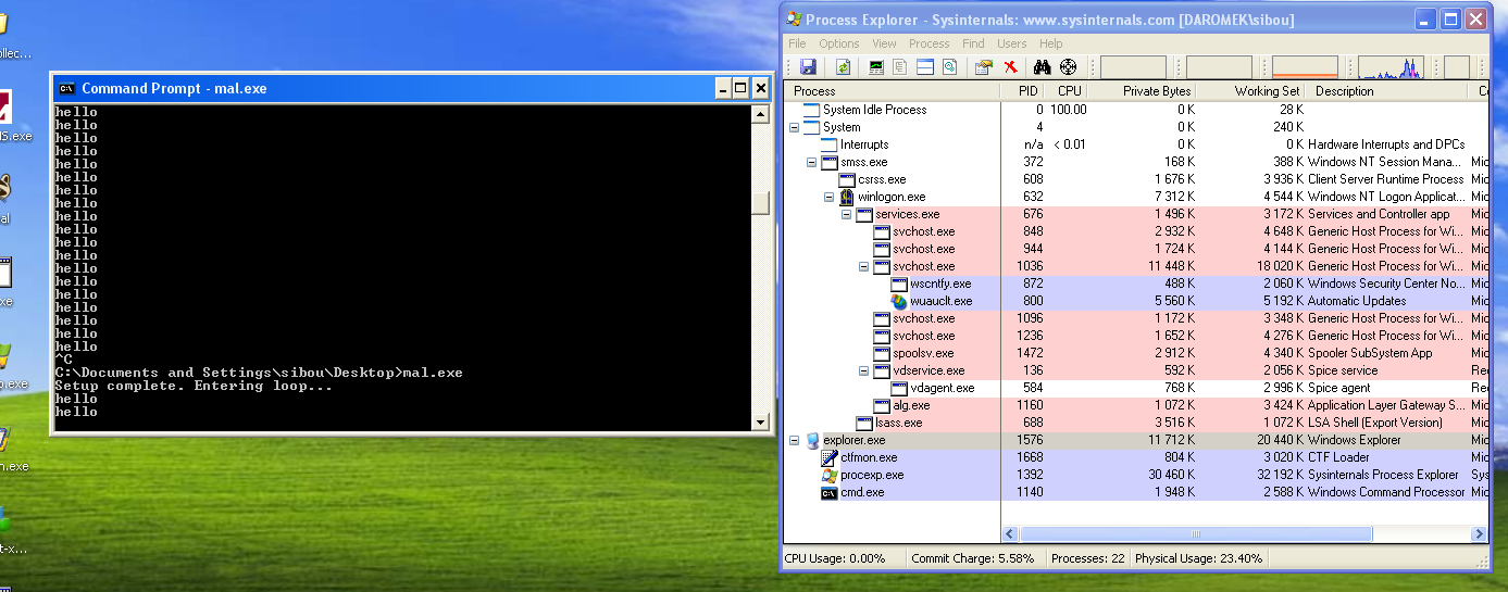 This driver is essentially a “generic” rootkit component. Any process that calls this IOCTL will be unlinked and hidden. To verify this, I wrote a simple C program to connect to the driver using the same parameters and enter an infinite loop printing “hello.”