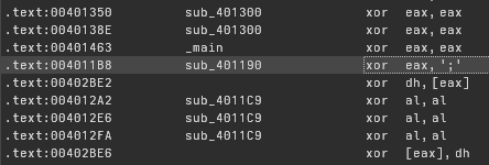 Most xor instructions in the binary are simple register clears. However, one instance stands out in sub_401190, where a byte is XORed with the ASCII character ’;’. Further inspection confirms this behavior.