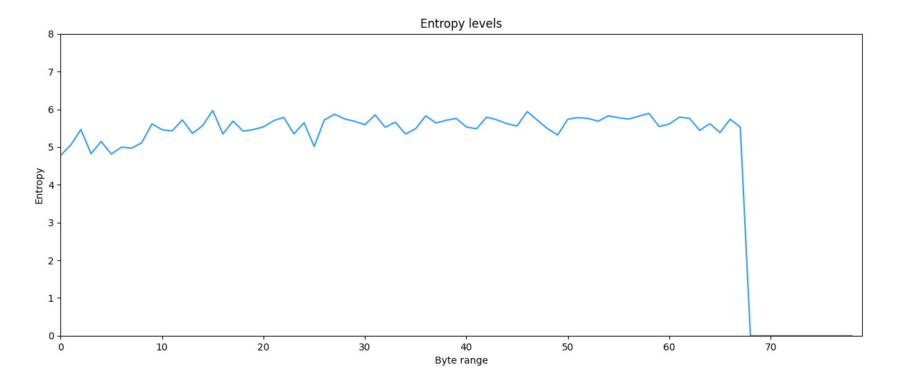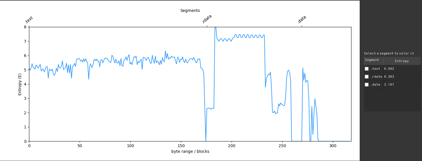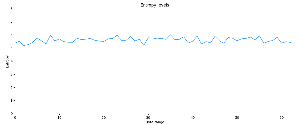 FindCrypt2 and IDA Entropy did not provide useful results. FindCrypt2 detected no known cryptographic constants, and the entropy across the binary remained fairly consistent, hovering between 5 and 6, which does not strongly indicate standard encryption.