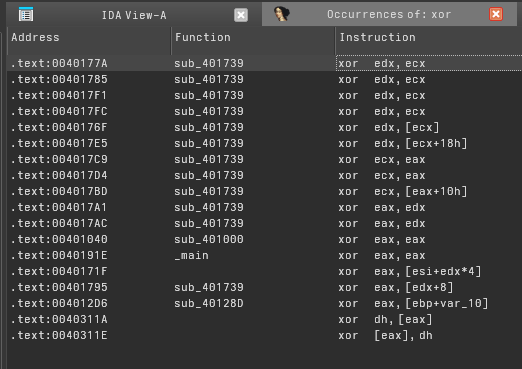 The number of XOR hits is notable. Most of them are located inside sub_401739, and they do not resemble simple register clearing operations. This suggests that the function likely performs some form of encoding or transformation.
