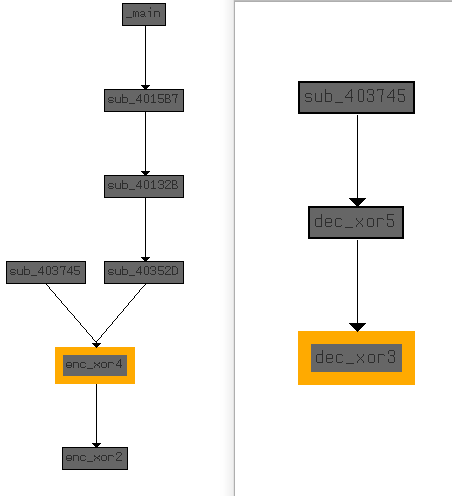 Graph analysis shows that enc_xor4 wraps enc_xor2, and dec_xor5 wraps dec_xor3. The dispatcher function sub_403745 selects encryption or decryption, while sub_40352D consistently calls encryption and is connected undirectly to main, indicating that it represents the AES encryption routine.