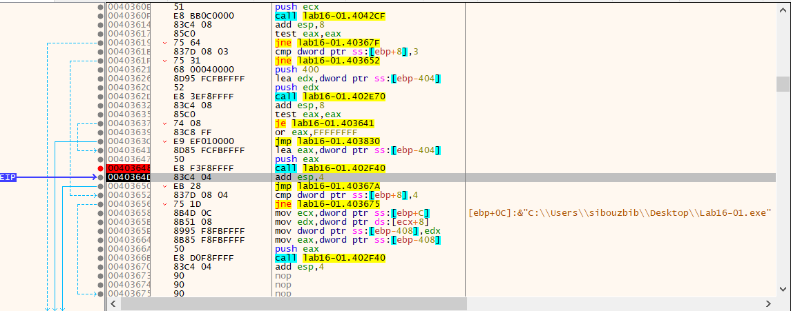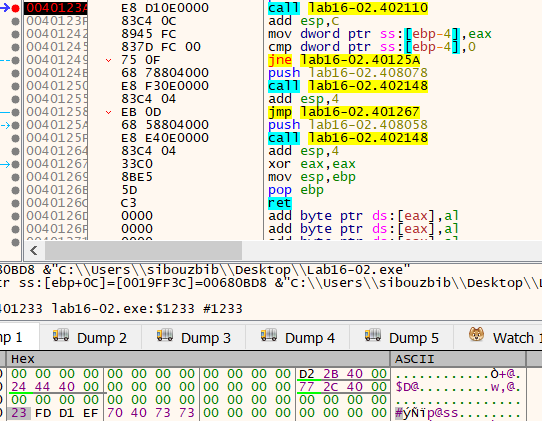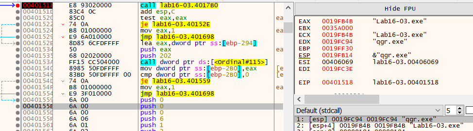 bypasses this check. Breaking on the strncmp afterward shows the correct filename should be peo.exe.