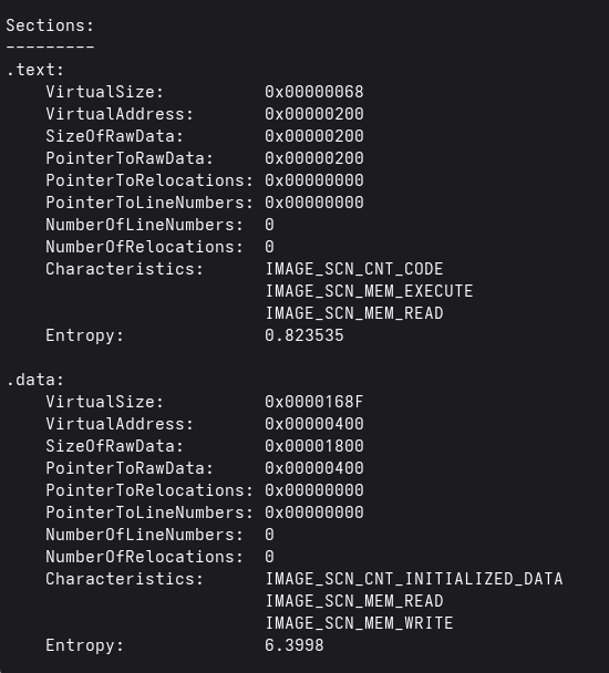 At first glance, seeing a PE file with almost no imports might suggest that the malware is packed or heavily obfuscated. However, that assumption quickly falls apart when examining the file’s contents. The .text and .data sections still exist and have reasonable sizes, and nothing in the strings output points toward UPX or any other common packer. Instead, the absence of imports is intentional: this malware is using runtime API resolution rather than static linking.