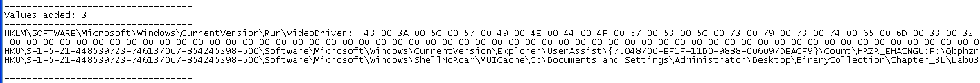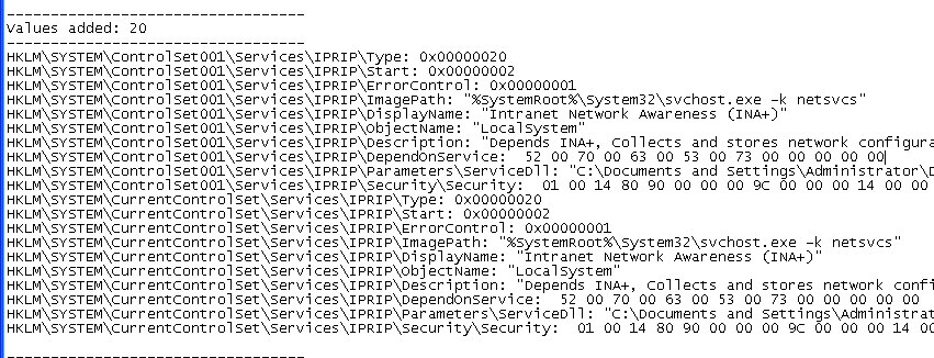 HKLM\SYSTEM\ControlSet001\Services\IPRIP\Parameters\ServiceDll: "C:\Documents and Settings\Administrator\Desktop\BinaryCollection\Chapter_3L\Lab03-02.dll"
