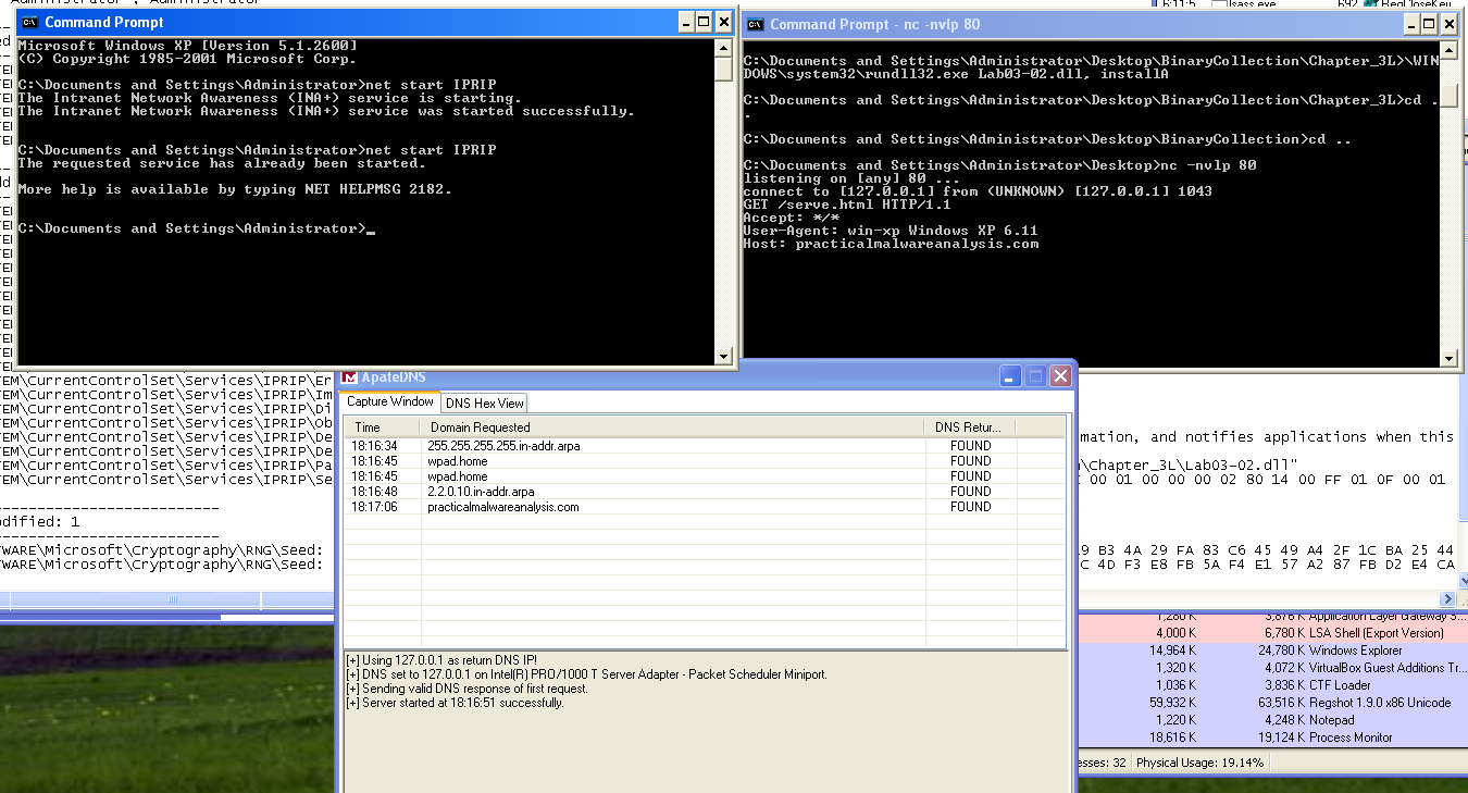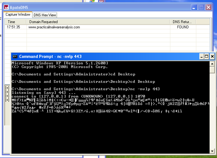 To analyze the malware’s network behavior, I used ApateDNS to redirect all DNS queries to my local analysis machine and listened on port 443 with nc. The sample attempts to resolve and contact: www.practicalmalwareanalysis.com