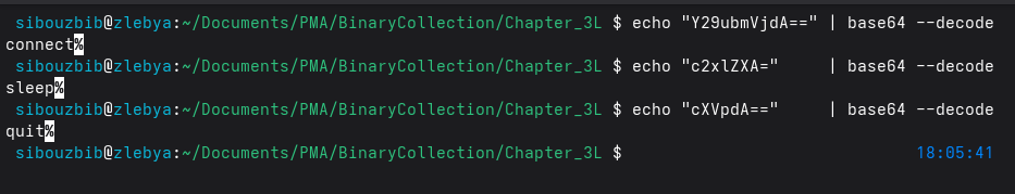 Strings output also hint at a network communication through HTTP, and it also contains base64 obfuscated commands.