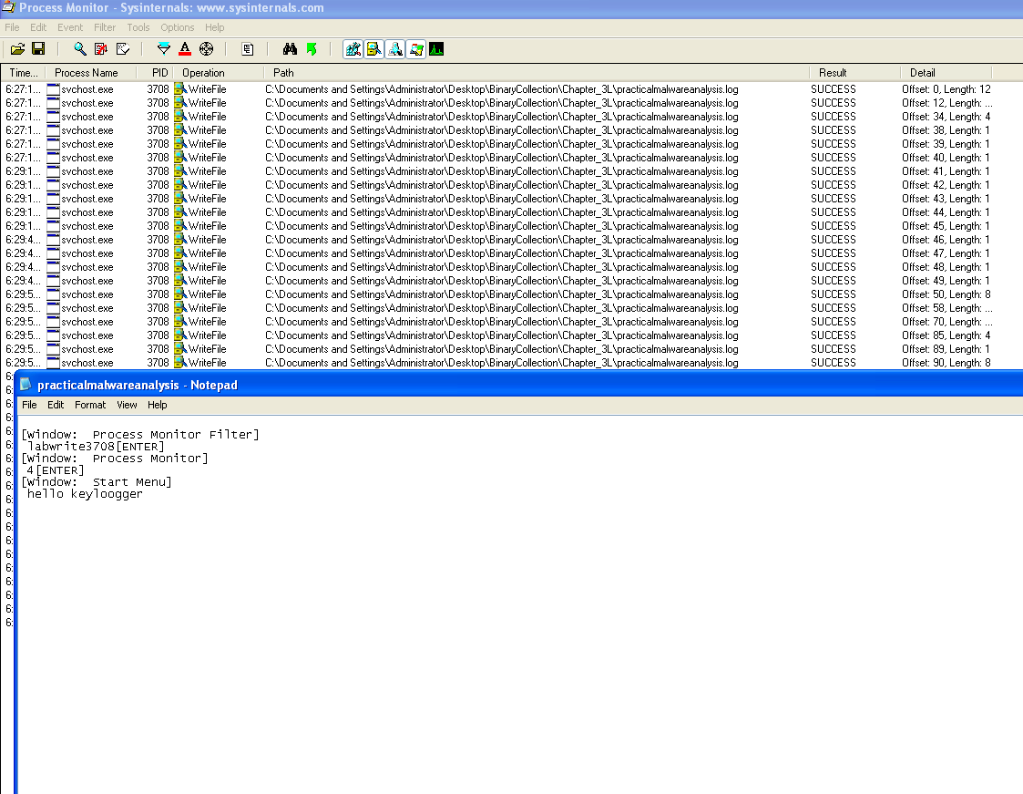 Process Monitor also shows that the malware creates a new file in its execution directory. Navigating there reveals: practicalmalwareanalysis.log