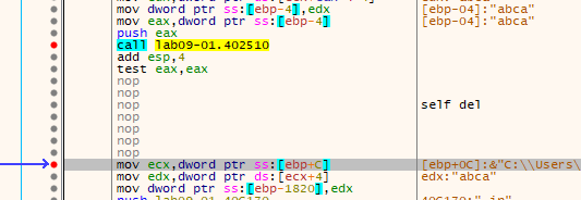 This code path is reached whenever the malware is executed with command-line arguments. A function is called with one of those arguments, and depending on its return value, execution either continues normally or branches to another routine. That branch leads to a self-deletion function, as indicated by the presence of strings such as “/c del ” and “ >> NUL” within the called code.