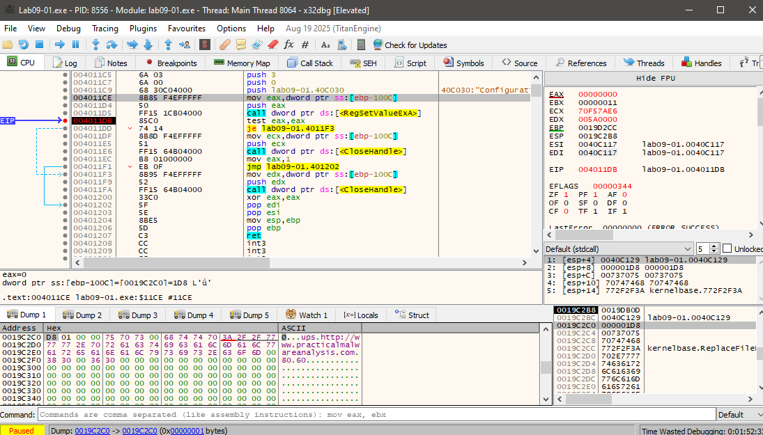 Rather than fully reversing the entire routine, the malware can be debugged and execution halted just before the registry value is written, at address 004011DB. At that point, the stored data becomes visible: multiple null-separated strings containing “ups”, the C2 URL, and the values “80” and “60”. Any subsequent access to this registry key should therefore be monitored, as it likely governs the malware’s communication behavior.