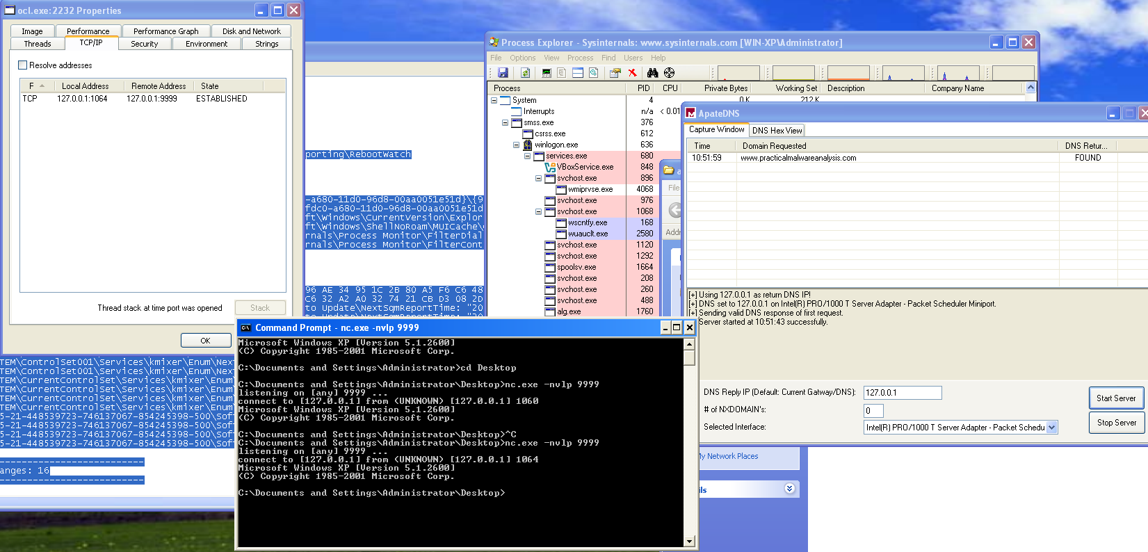 To observe the payload behavior, traffic can be redirected to localhost using a mock DNS server. Under these conditions, the malware issues a DNS request for “www.practicalmalwareanalysis.com”, and using nc to listen on localhost port 9999, a reverse shell becomes apparent. This behavior is further confirmed in Process Explorer, where an active TCP session is visible and a cmd.exe child process is spawned by ocl.exe, conclusively demonstrating successful execution of the malicious payload.