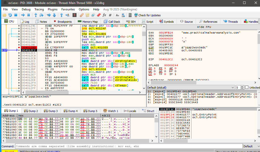 If this comparison succeeds, execution continues normally. If it fails, the malware exits silently without performing any malicious actions. While this check could be bypassed by patching the comparison in a debugger such as x32dbg, the simplest approach is to rename the executable to ocl.exe.