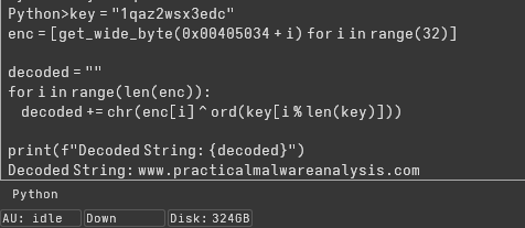 The same decryption can be performed statically using IDA’s Python console by extracting the encrypted byte array and applying the XOR operation with the key: