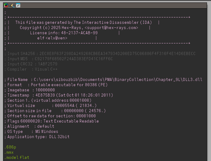 Only DLL1 and DLL2 are imported by Lab09-03.exe via Static Linking (they appear in the Import Address Table). Yet, the strings output contains DLL3.dll. Checking its reference in IDA, we see its name is pushed as an argument to LoadLibraryA. This confirms that DLL3 is dynamically imported at runtime, which is why it doesn’t show up in the initial imports table. All three DLLs share a preferred base address of 0x10000000, creating a conflict that forces the OS to relocate them.