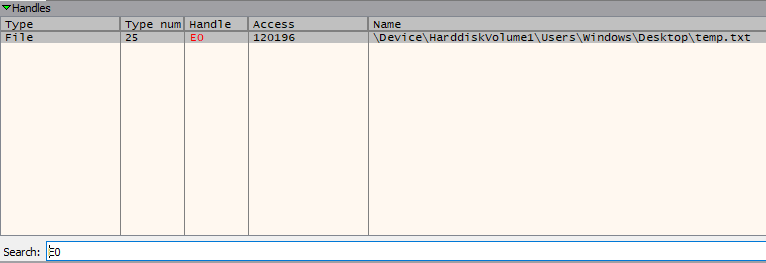 So the filename is temp.txt, which we could’ve also found out if we stopped the execution after the writefile and checked the loaded handles. In the debugger, right before the push ecx which contained the file handle ID loaded from the dll, we check the register value. Then inside the handles view, we filter using that ID and just like that we get out file full path.