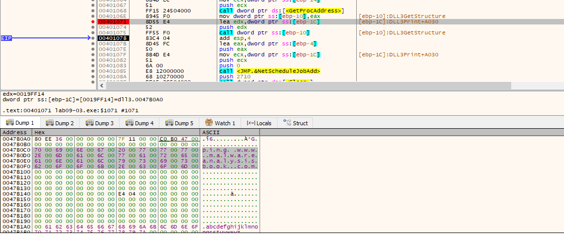 This specific Buffer is actually an AT_INFO structure, which is later pushed as the second parameter for NetScheduleJobAdd. By inspecting this buffer in the dump after the call, we see it contains the command: ping www.malwareanalysisbook.com. DLL3 essentially acts as a “config provider” for the scheduled task.